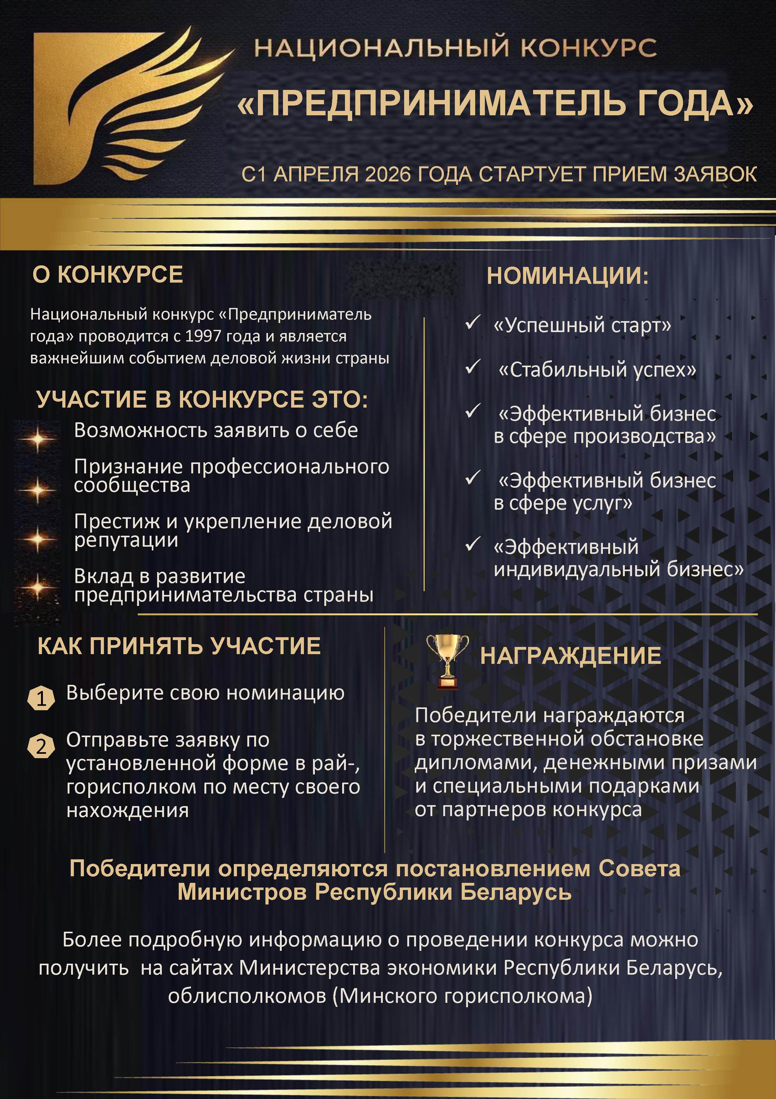 В соответствии с постановлением Совета Министров Республики Беларусь от 17 марта 2016 г. № 207 Министерство экономики объявляет о старте с 1 апреля 2026 г. Национального конкурса «Предприниматель года».